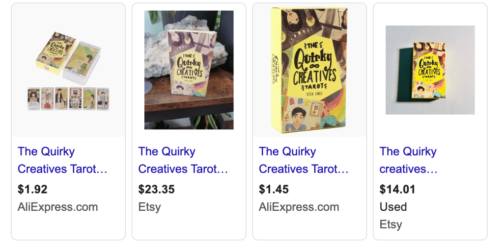 Unfortunately, there are counterfeit/bootlegged decks of The Quirky Creatives Tarot circulating all over the internet! It is a frustrating sight for me as an independent creator who put a lot of effort in making this tarot deck and I hope that you could help me fight this.